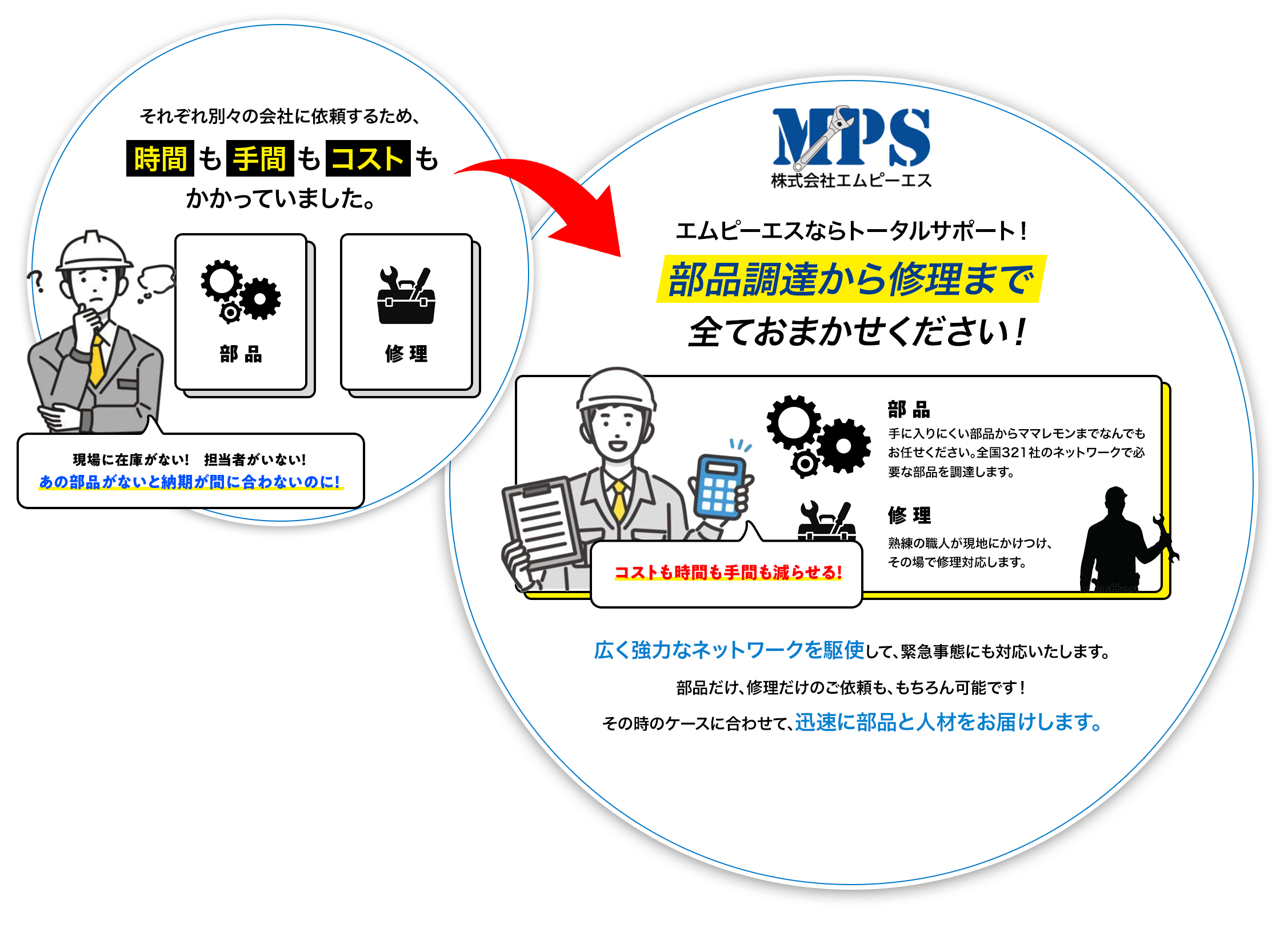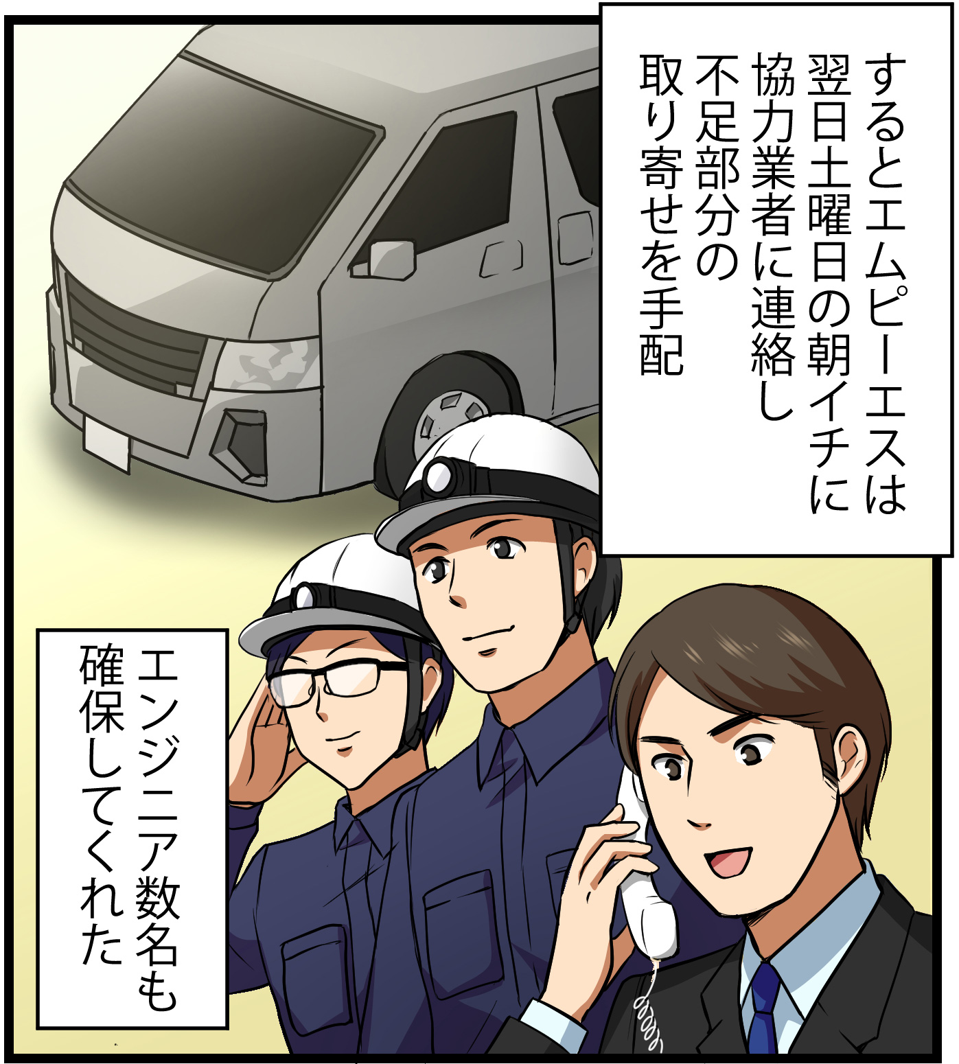 ※エムピーエスでは迅速な対応を心がけておりますが、本エピソードは一例です。トラブルの内容や部品の調達状況により、対応にお時間をいただく場合や解決が難しい場合がございます。詳細はお問い合わせの際にご確認ください。