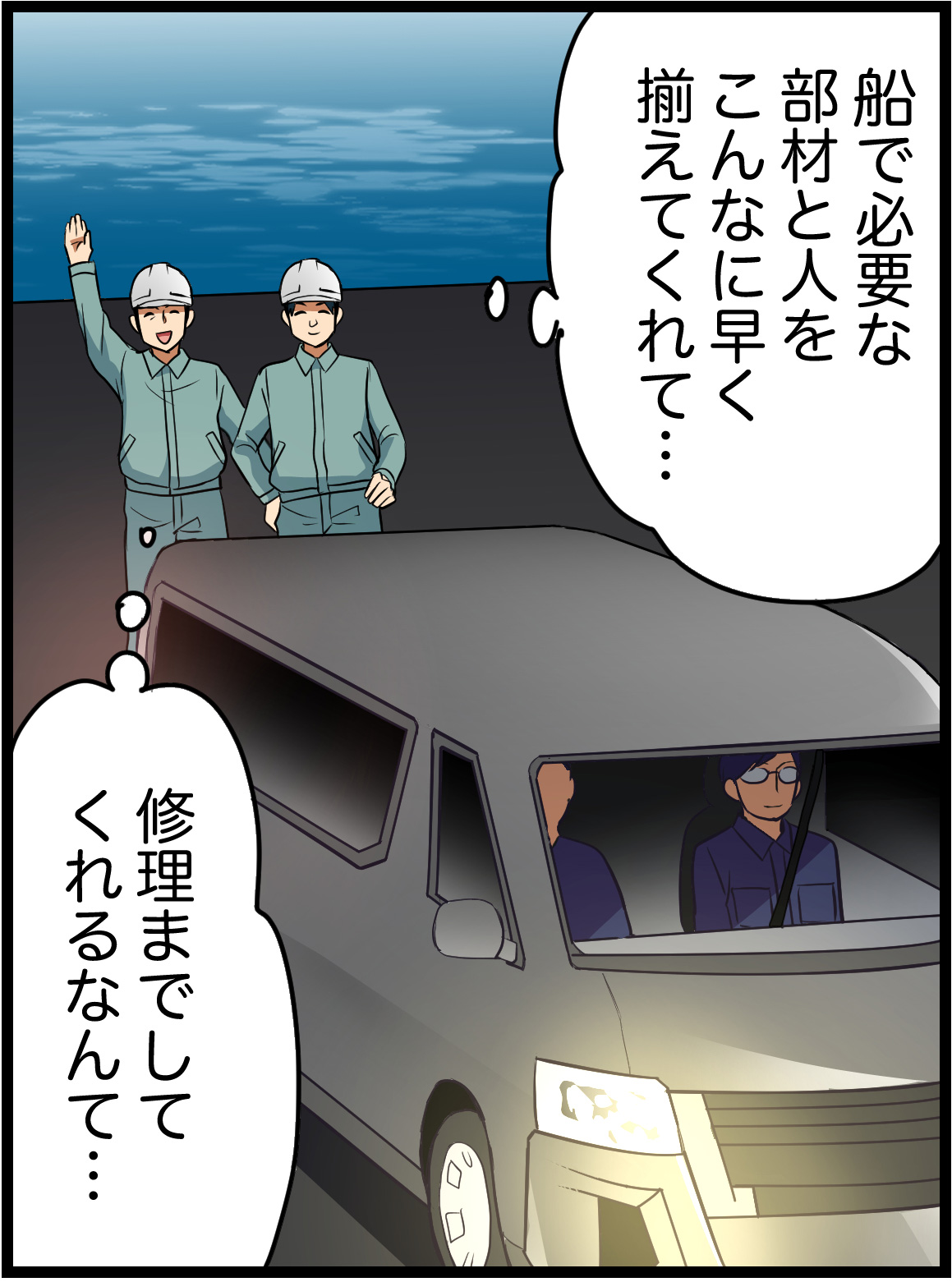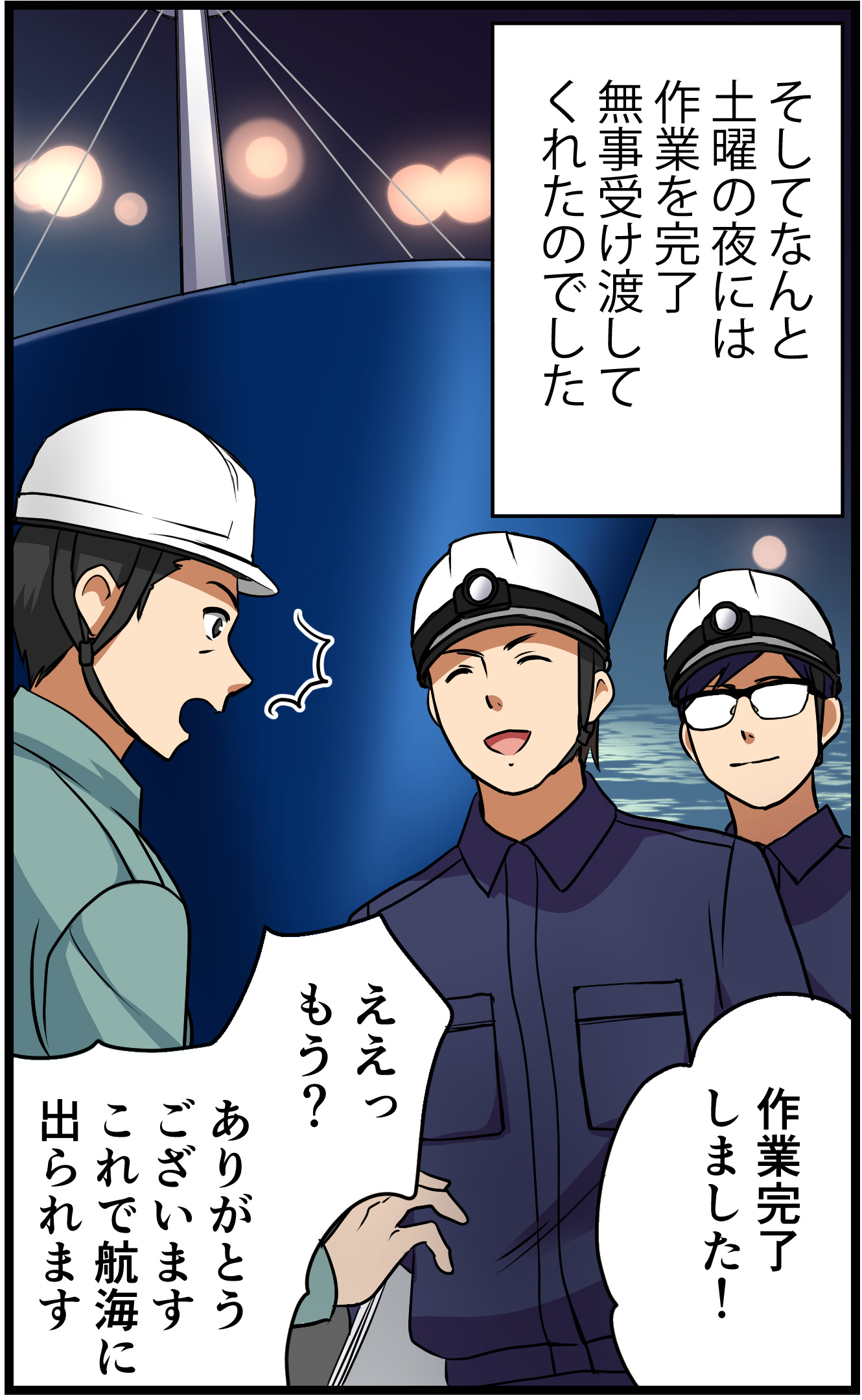 その結果、当日の夜中には交換作業を無事に完了し、翌日も予定時間通りに出航することができました。迅速かつ的確なご対応に、心より感謝申し上げます。